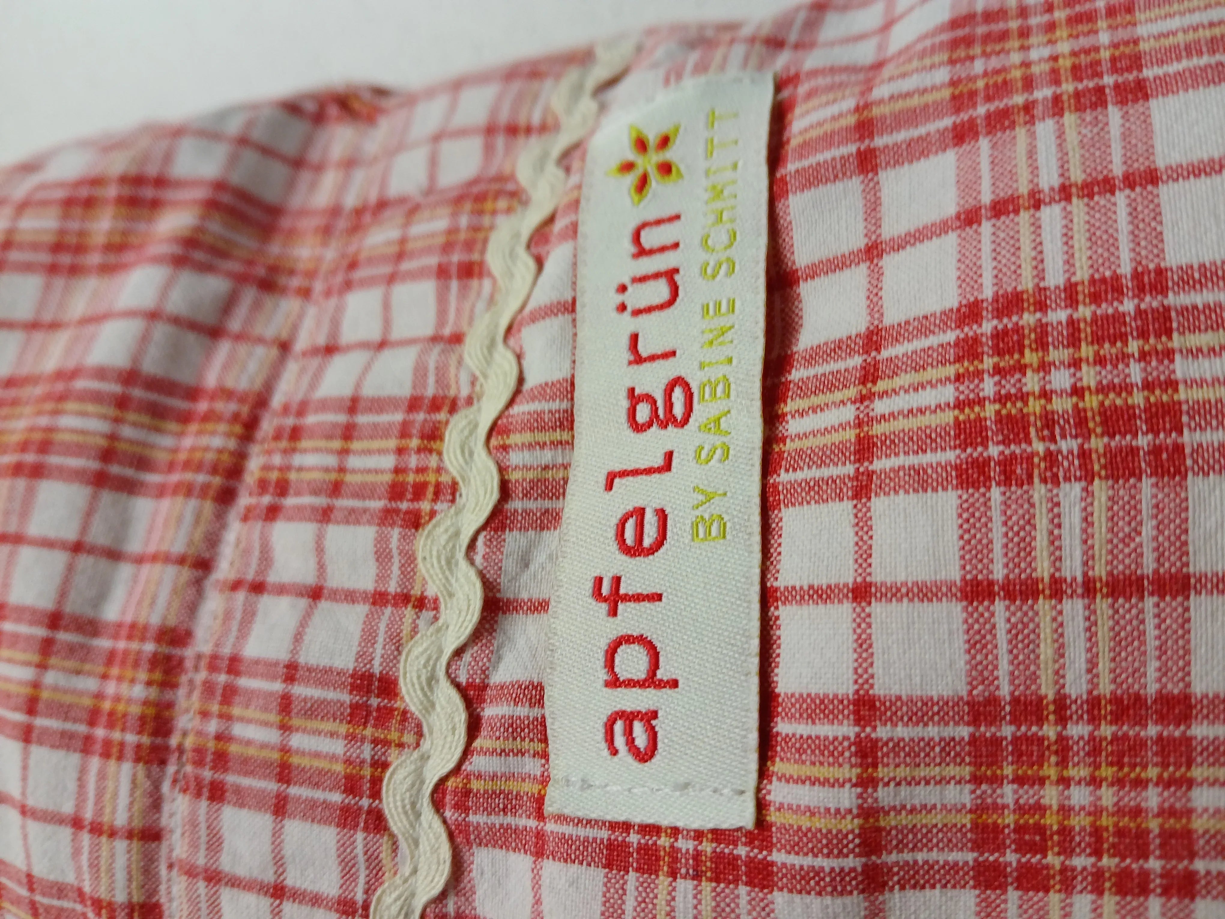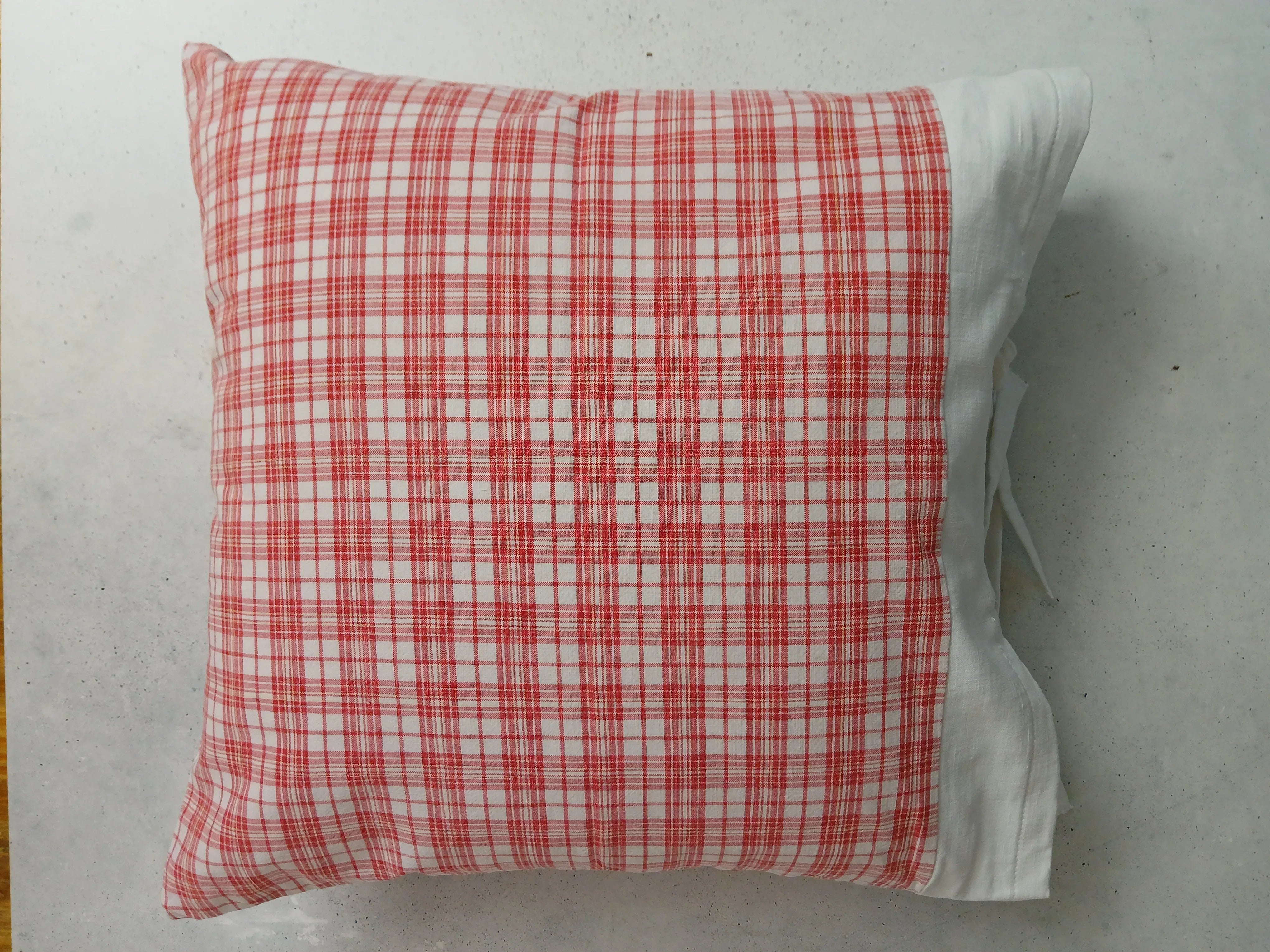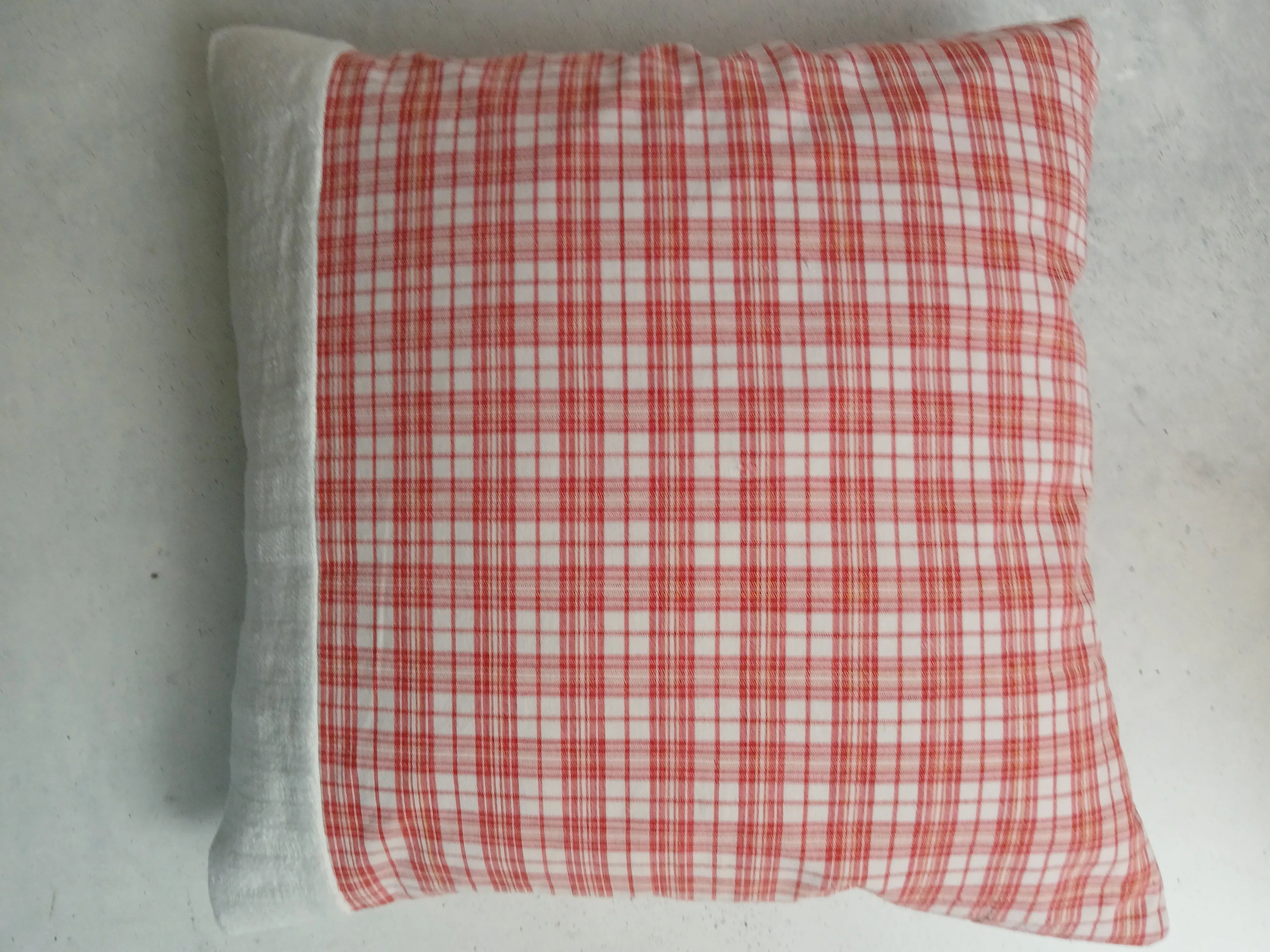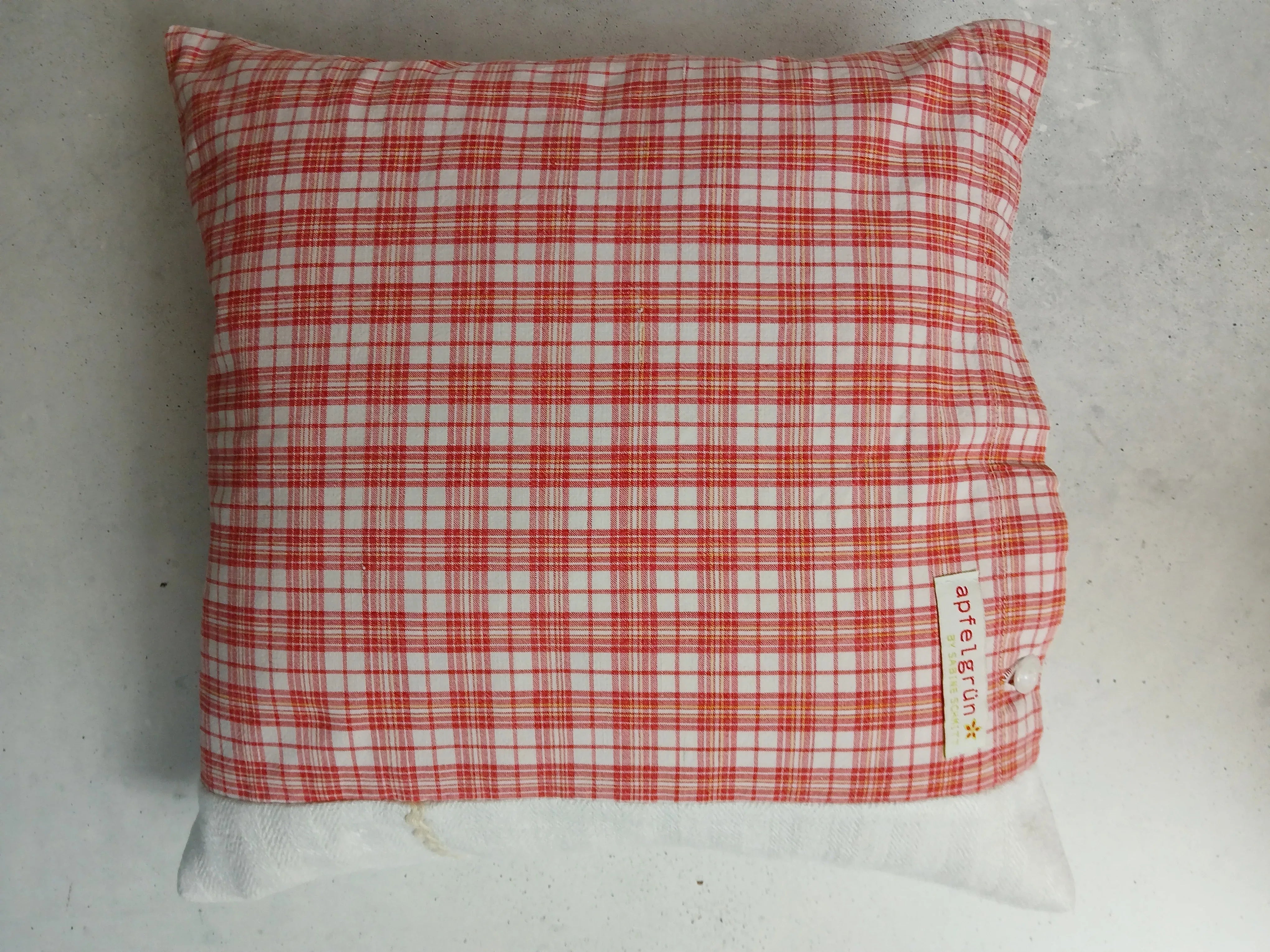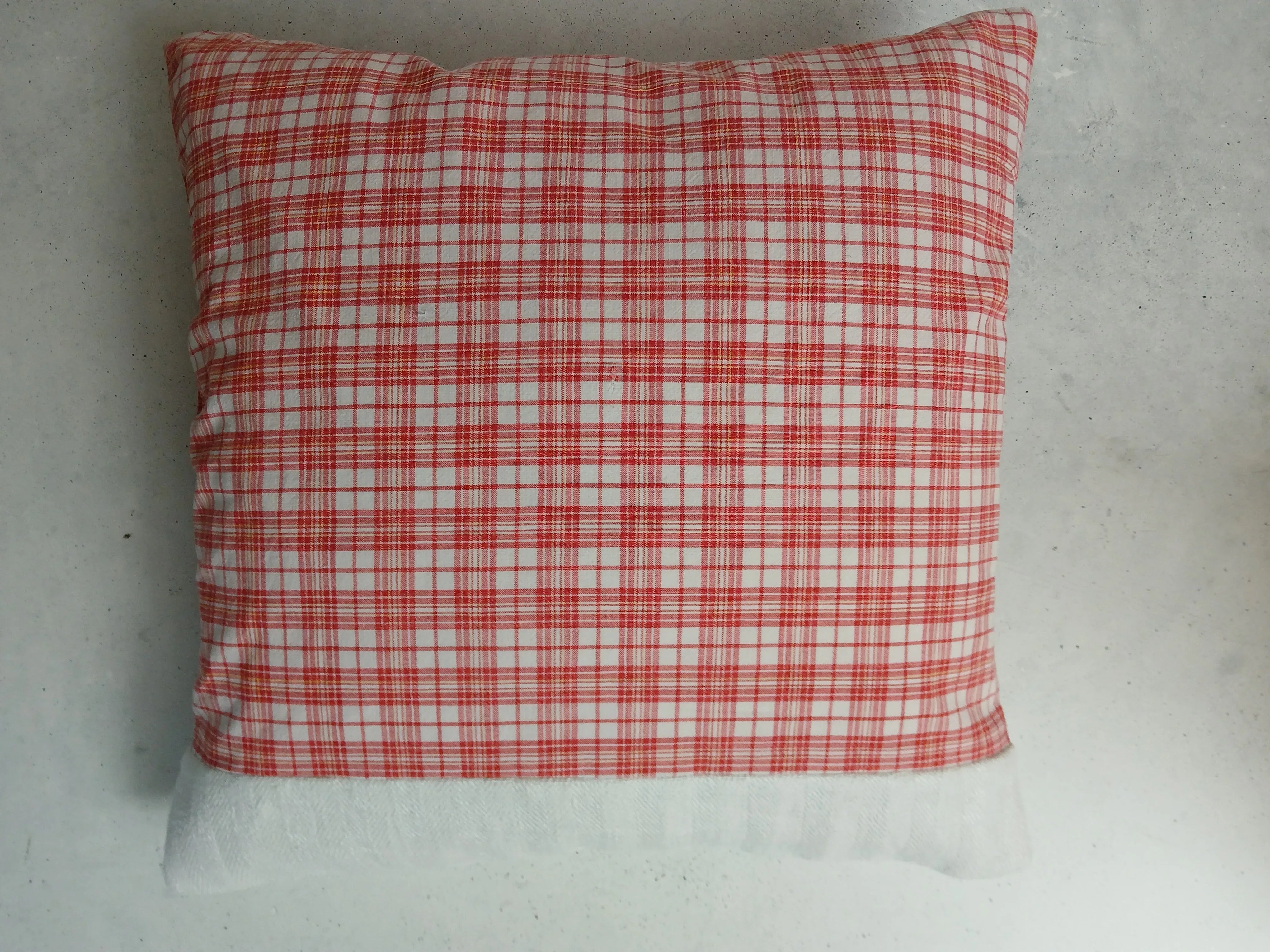 Der rot-weiße Karostoff besteht aus 100 % Baumwolle (40 x 40 cm) und stammt aus einem Upcycling-Projekt. Sorgfältig verarbeitet und handgenäht.
