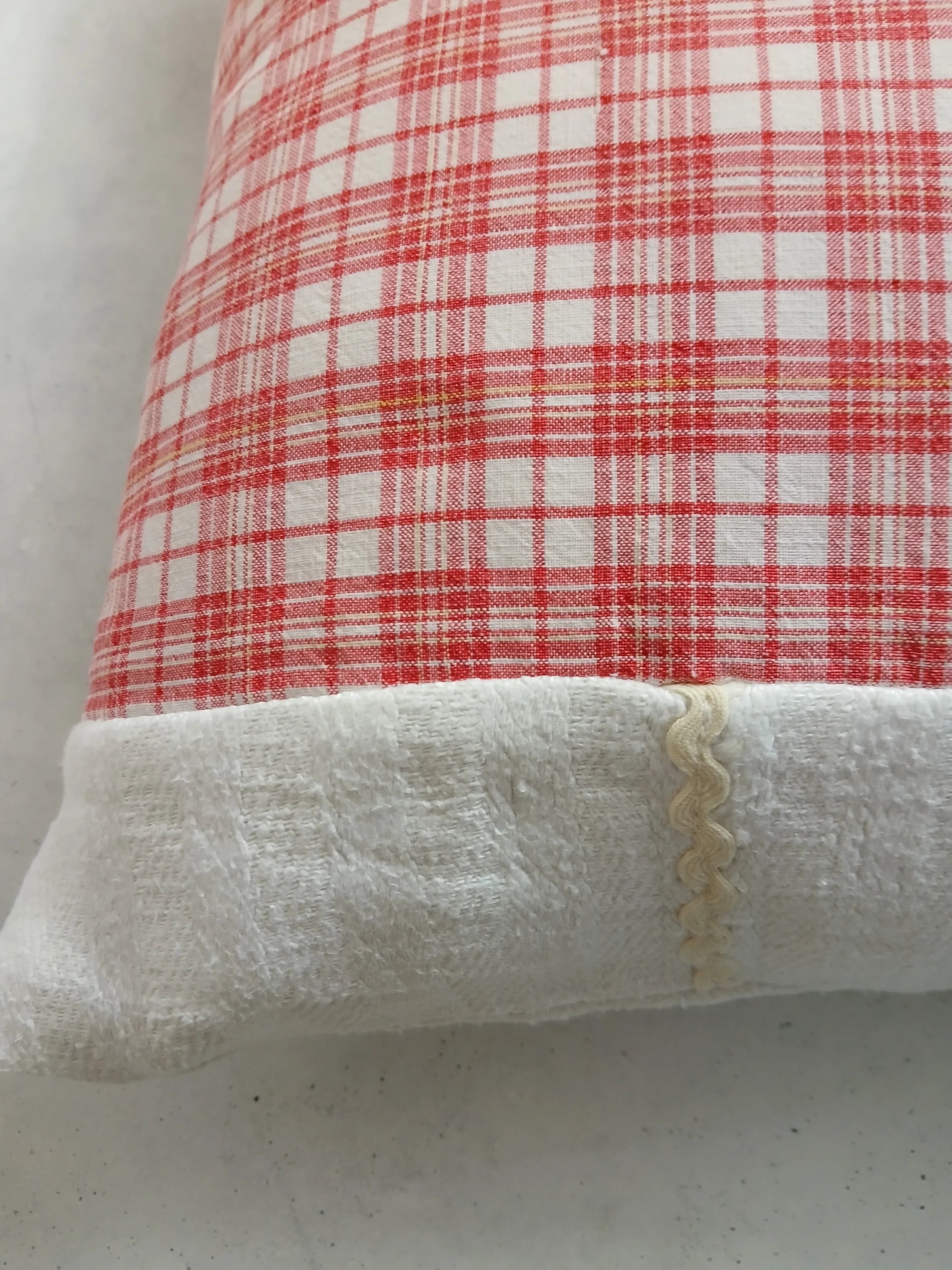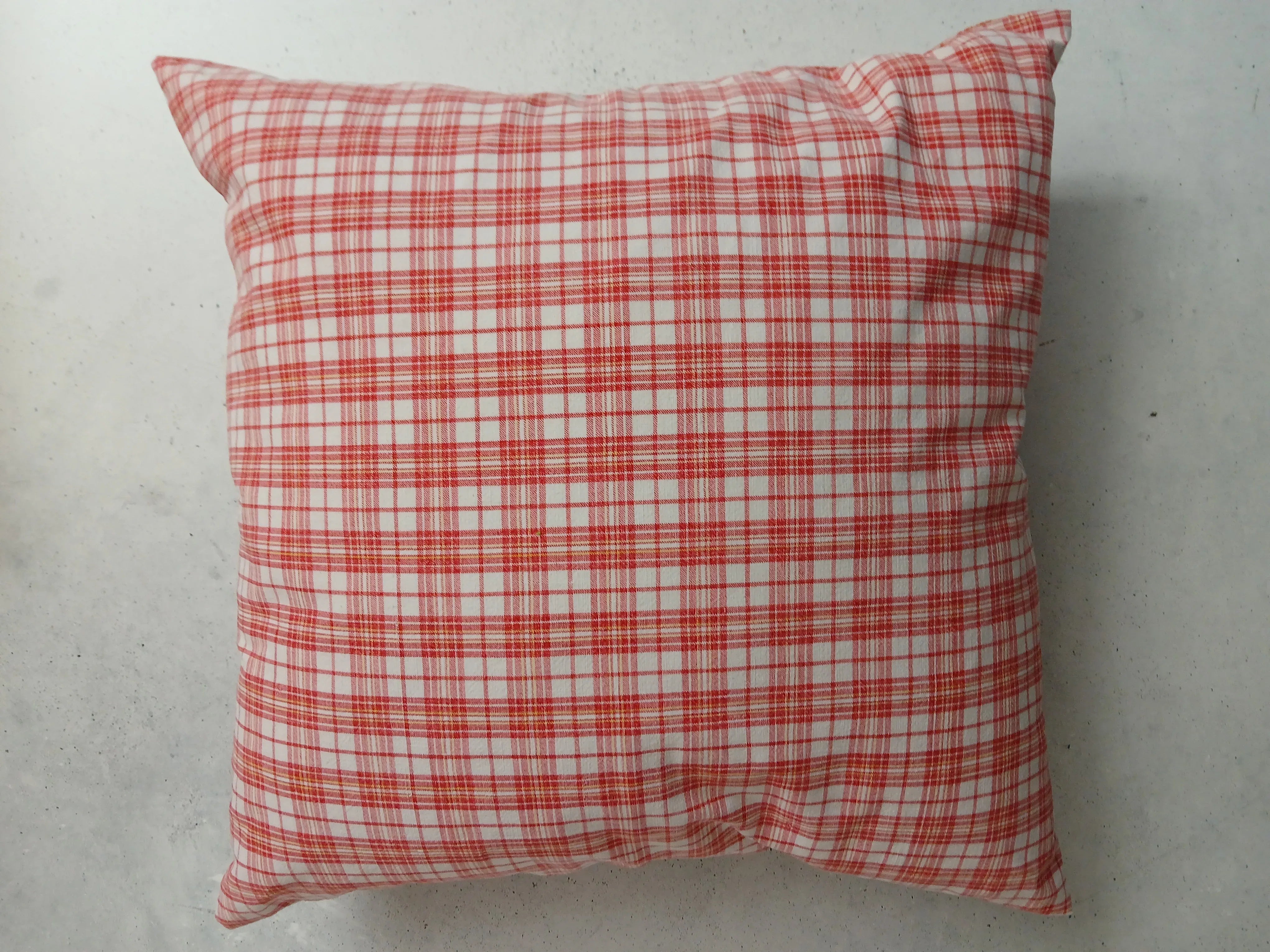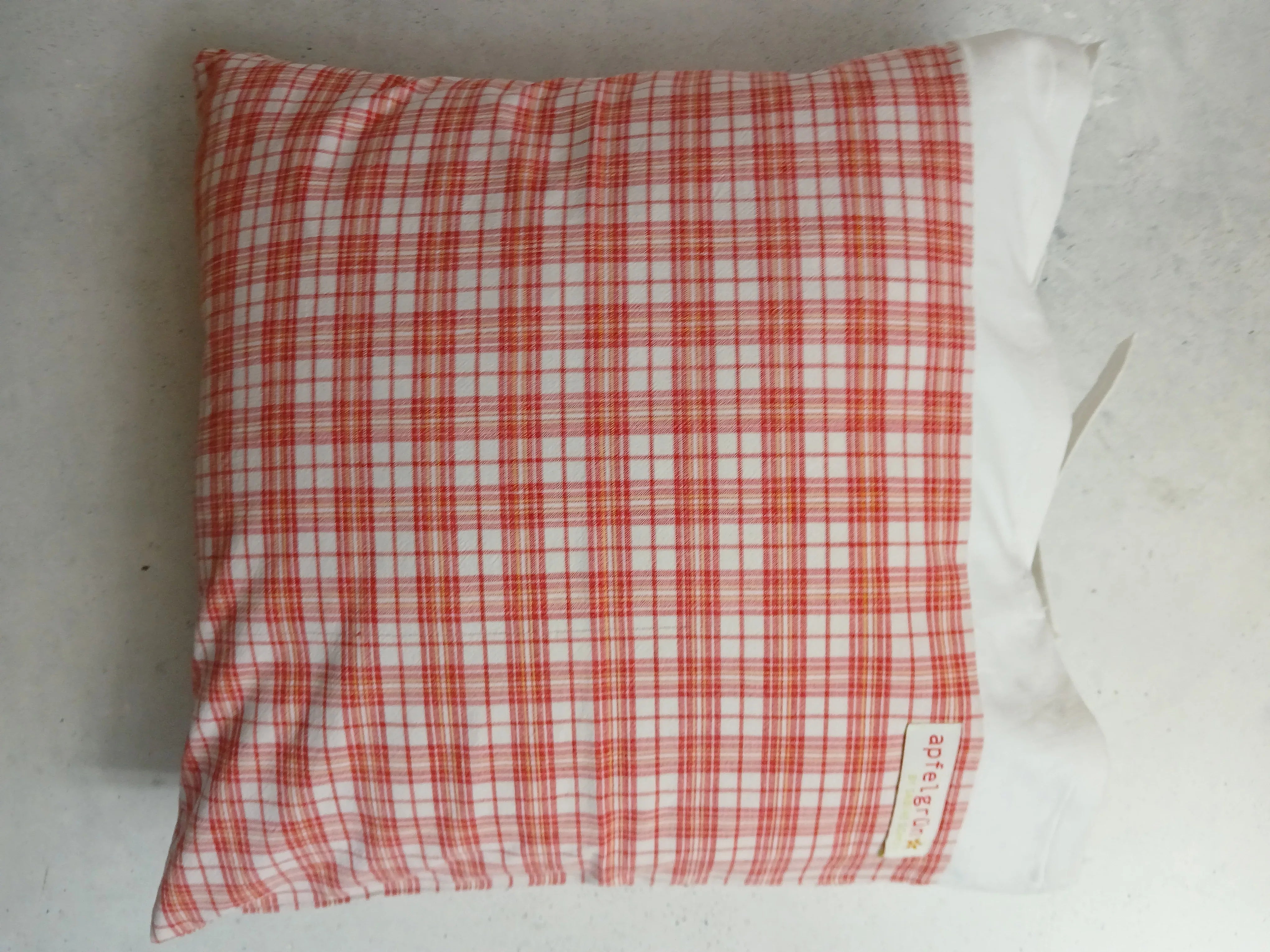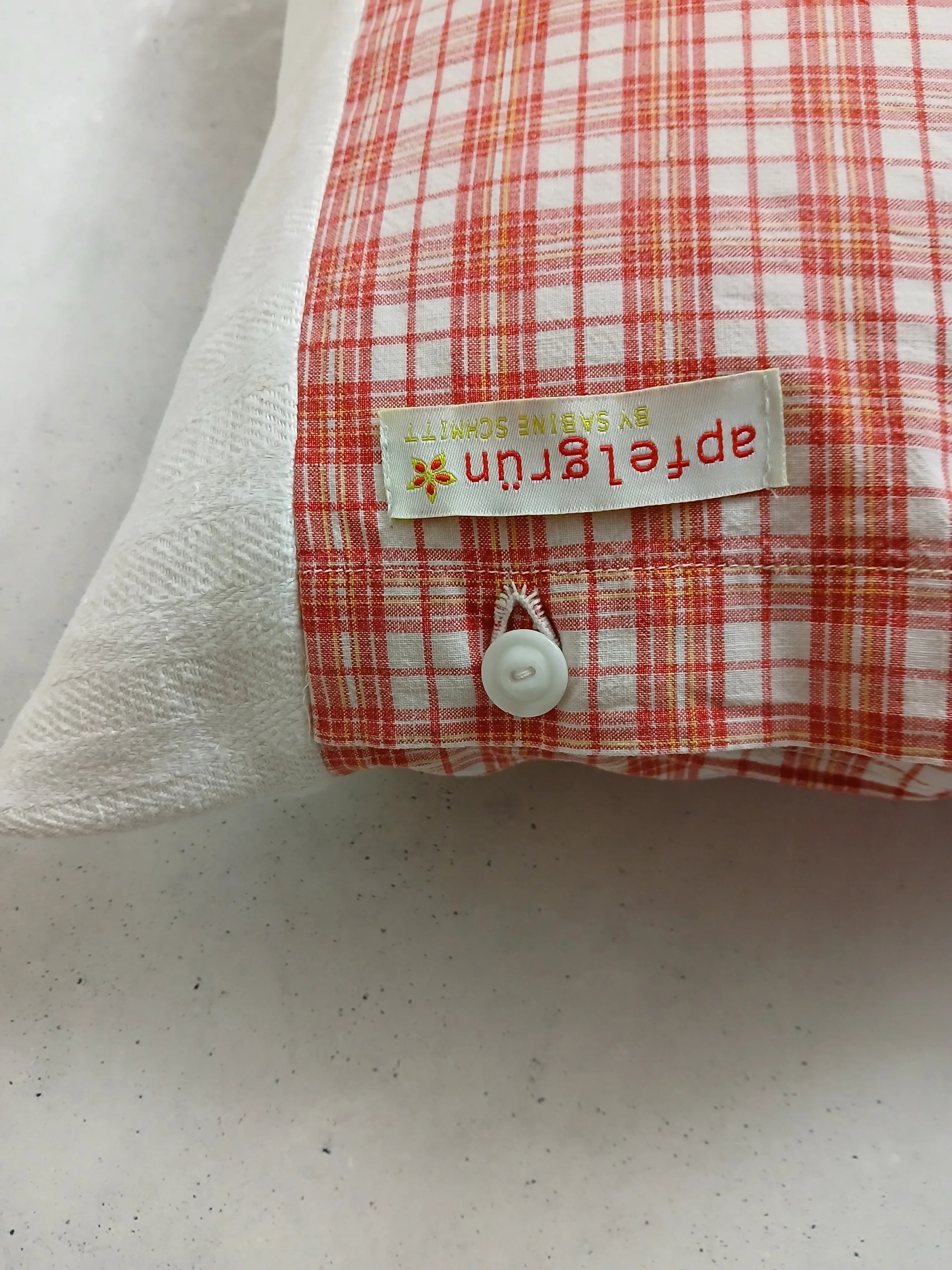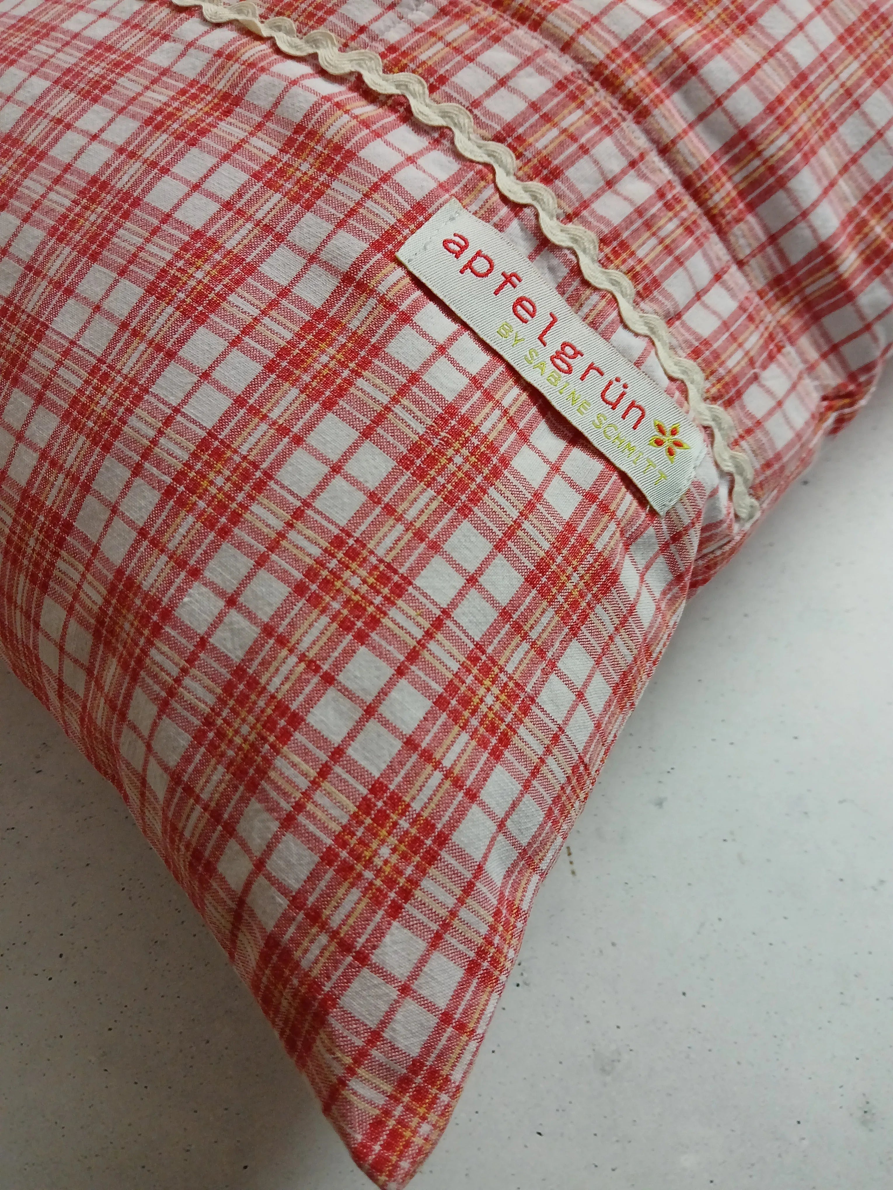Der rot-weiße Karostoff besteht aus 100 % Baumwolle (40 x 40 cm) und stammt aus einem Upcycling-Projekt. Sorgfältig verarbeitet und handgenäht.