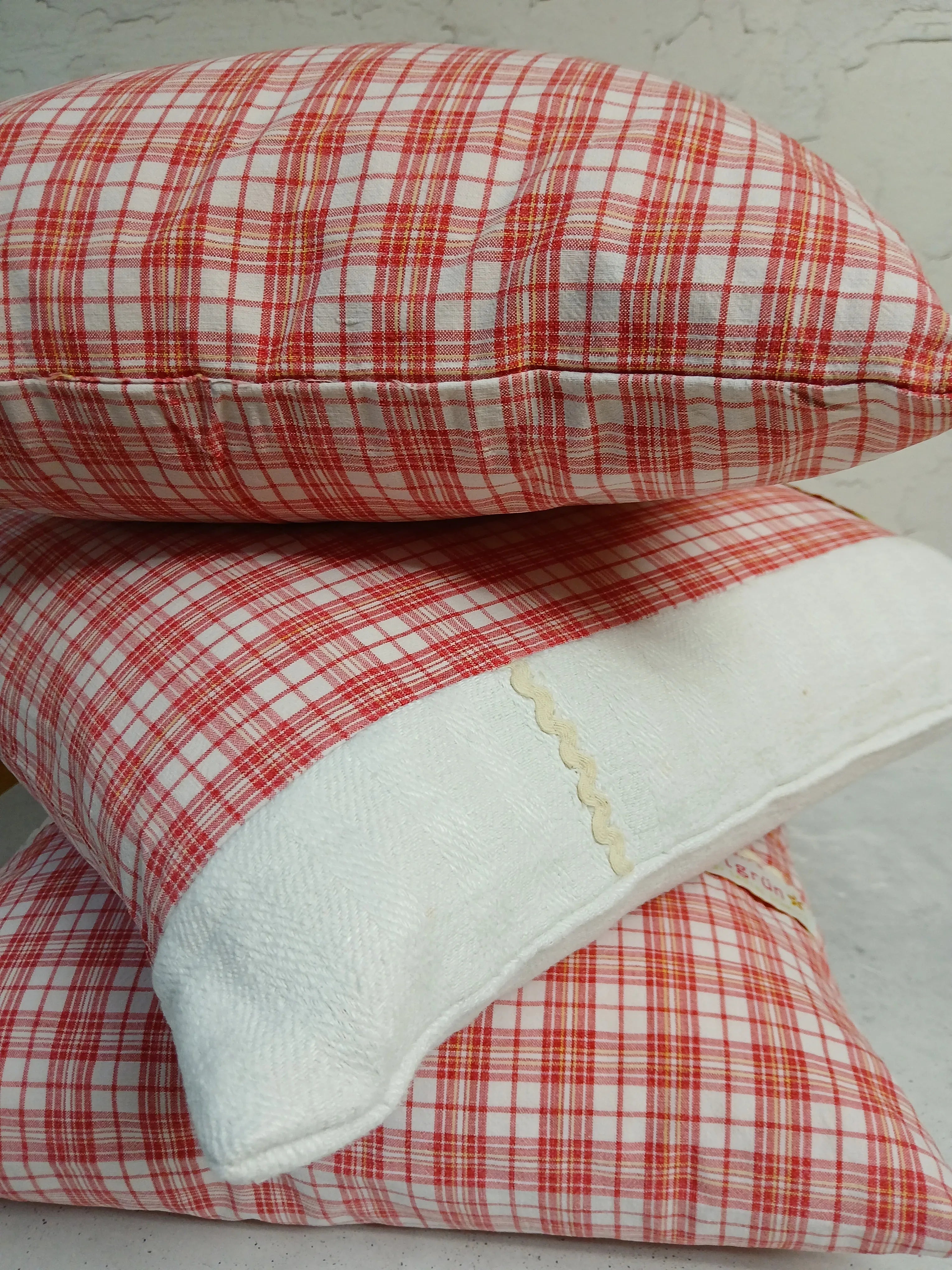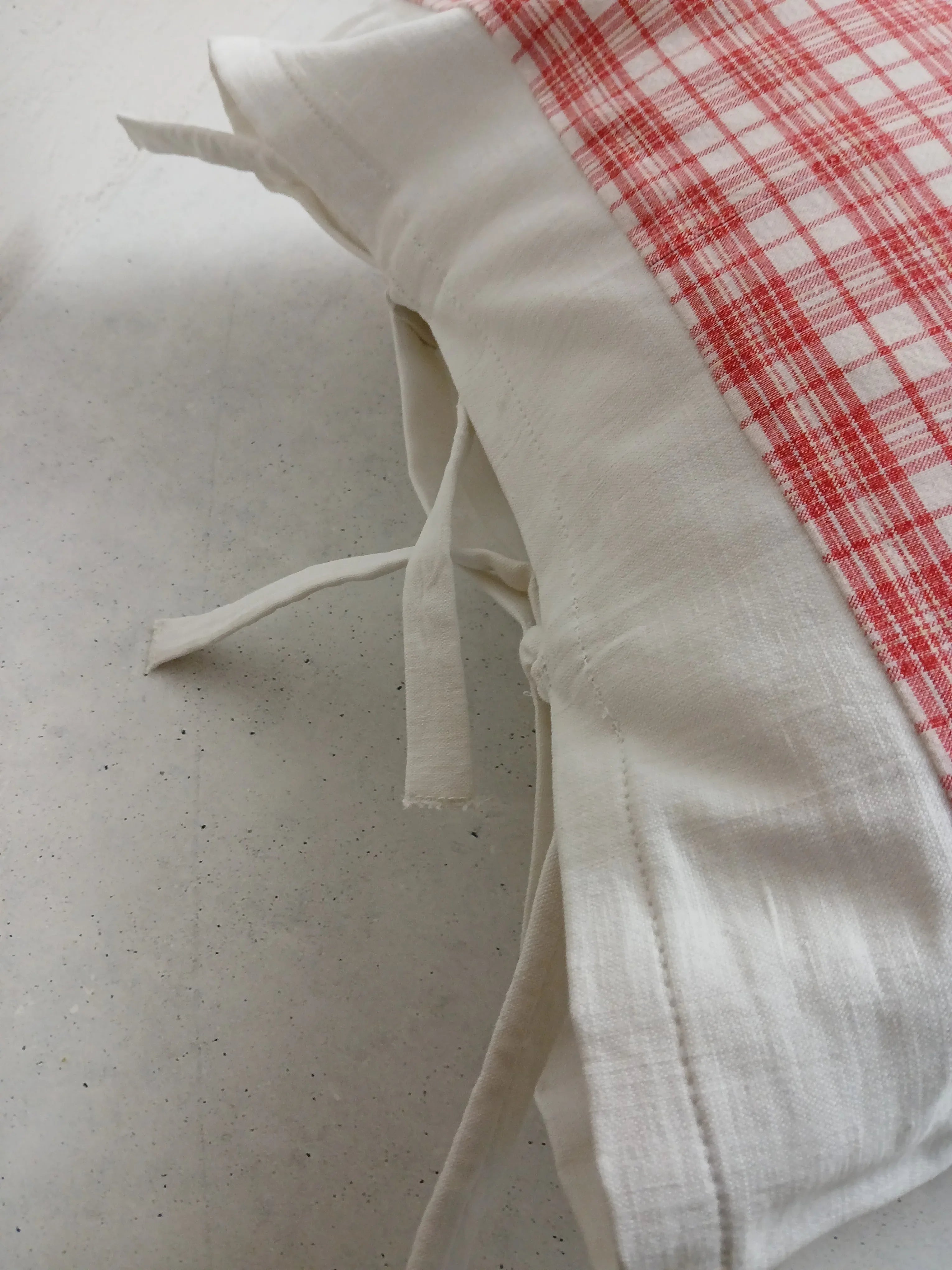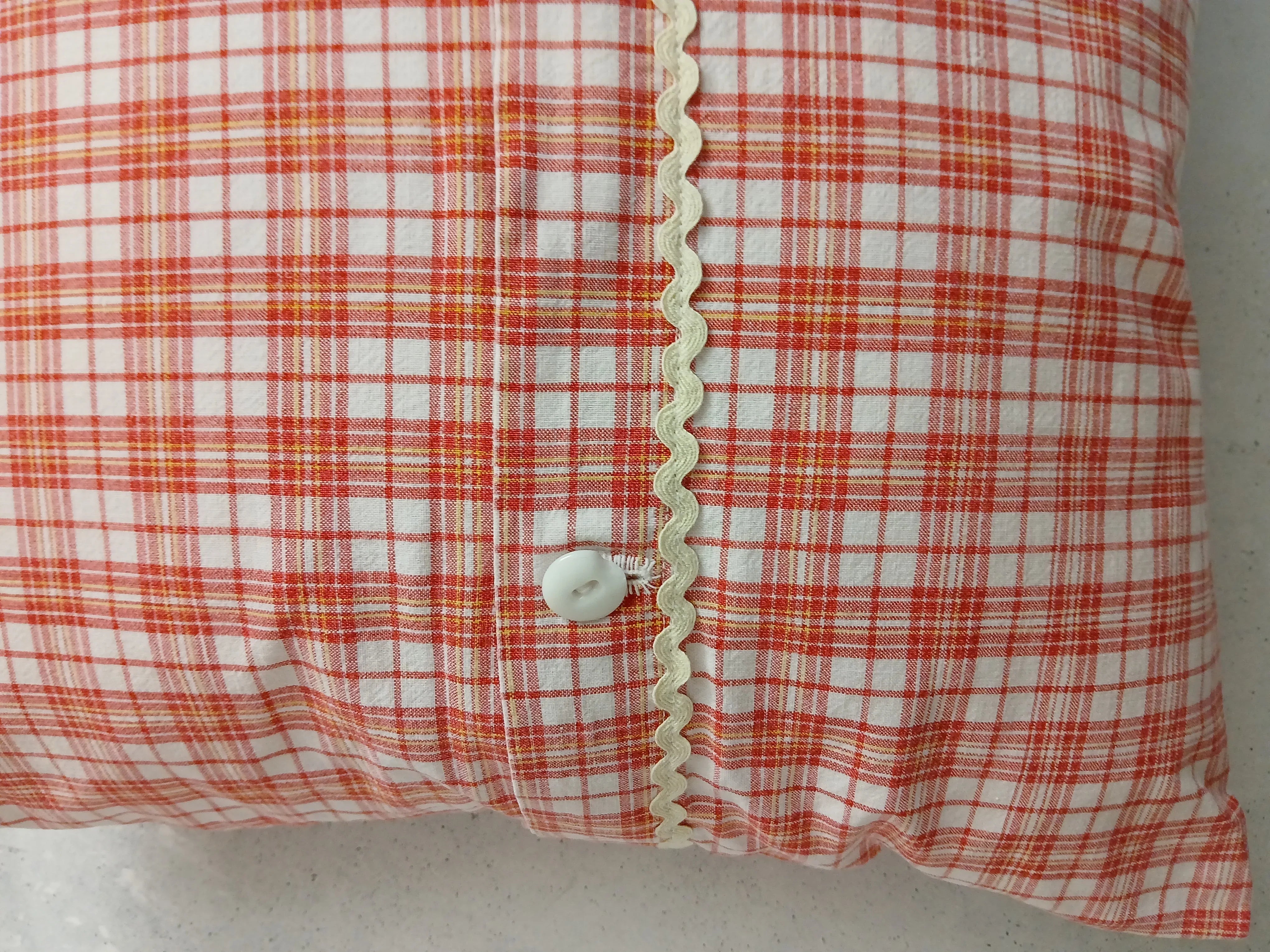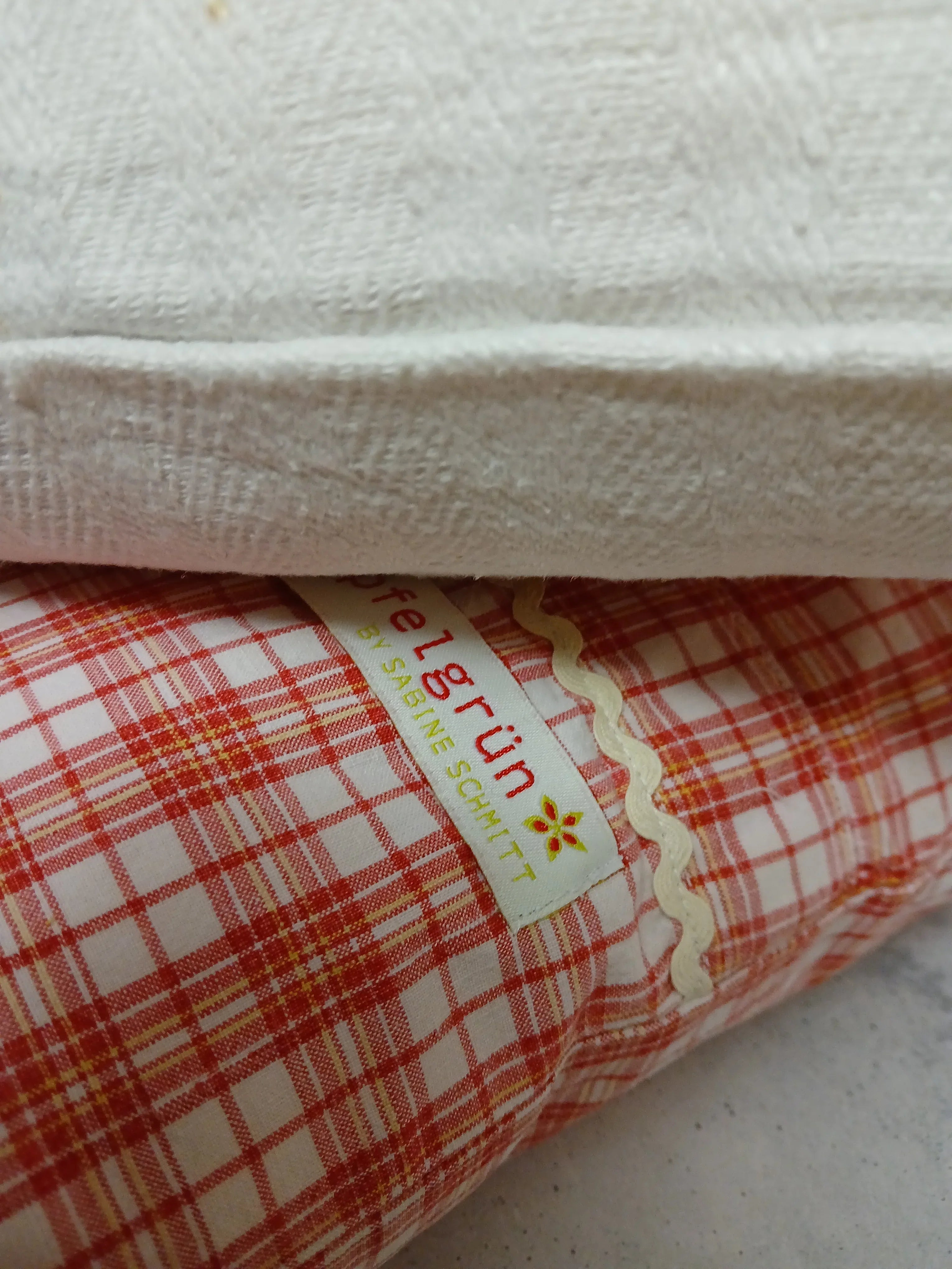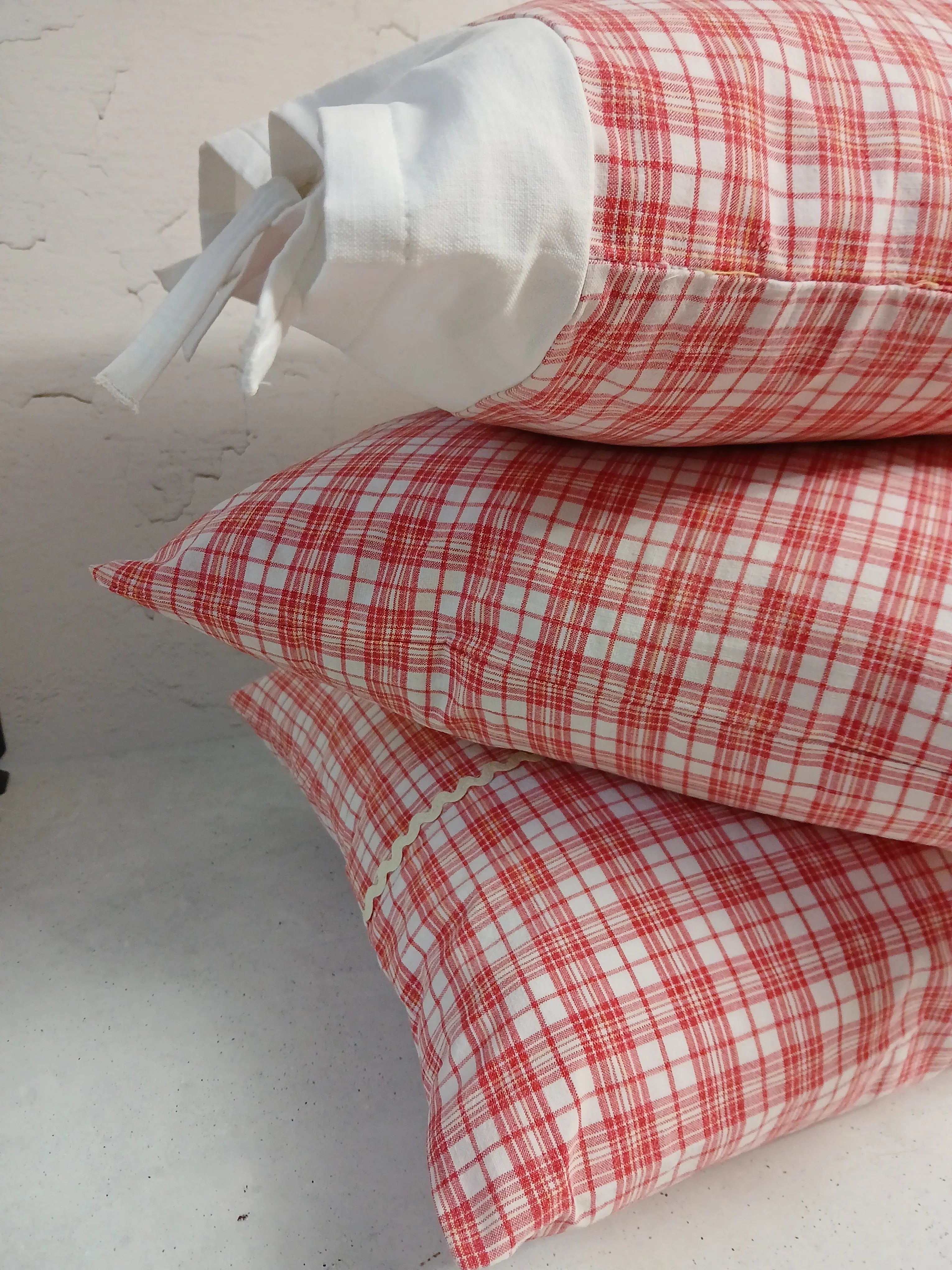Der rot-weiße Karostoff besteht aus 100 % Baumwolle (40 x 40 cm) und stammt aus einem Upcycling-Projekt. Sorgfältig verarbeitet und handgenäht.