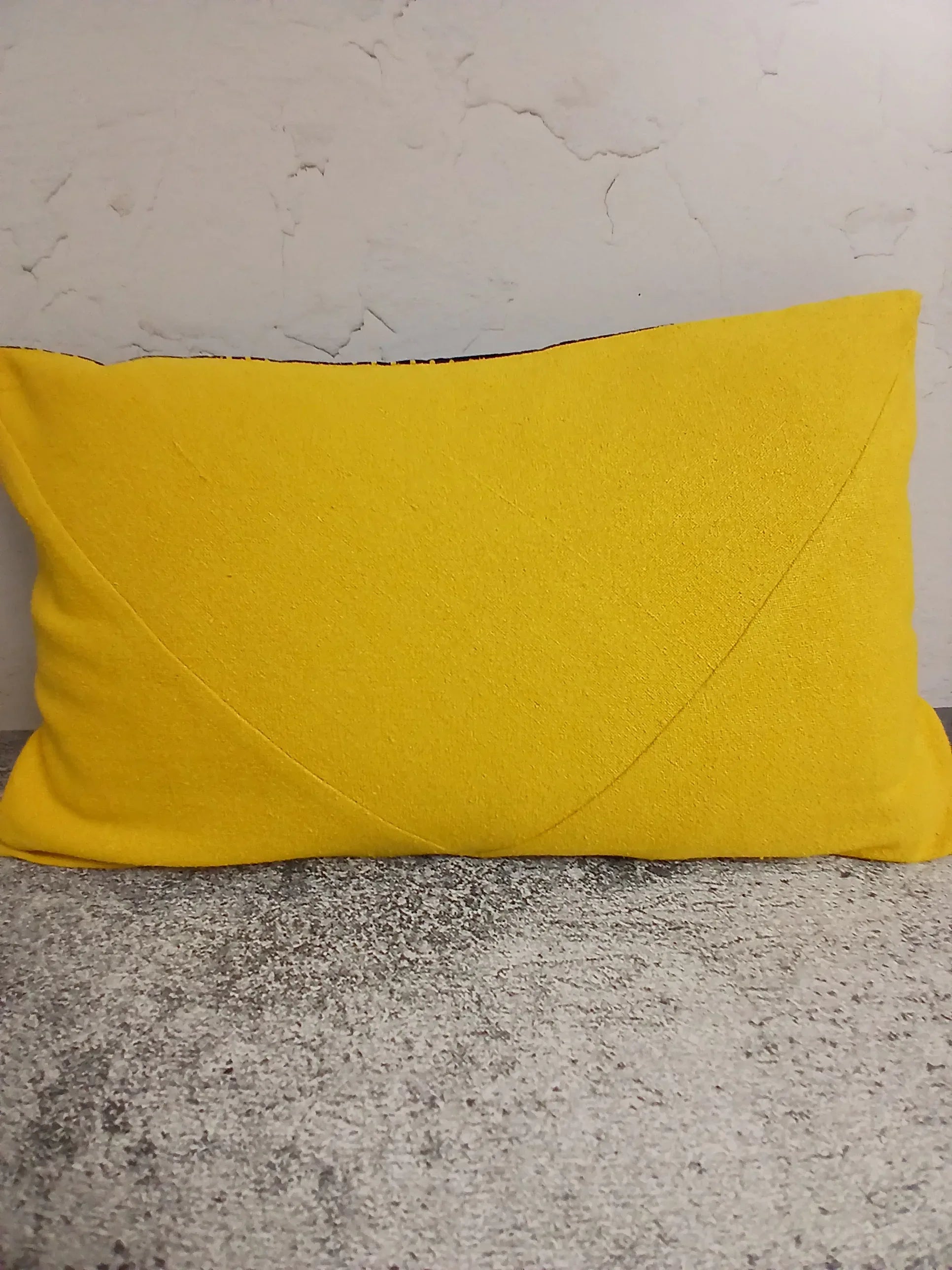 Diese handgefertigte Kissenhülle verbindet einen grob gewebten, upgecycelten Baumwollstoff in warmem Gelb mit schwarzem Shweshwe aus Südafrika, akzentuiert durch feine gelbe Punkte.